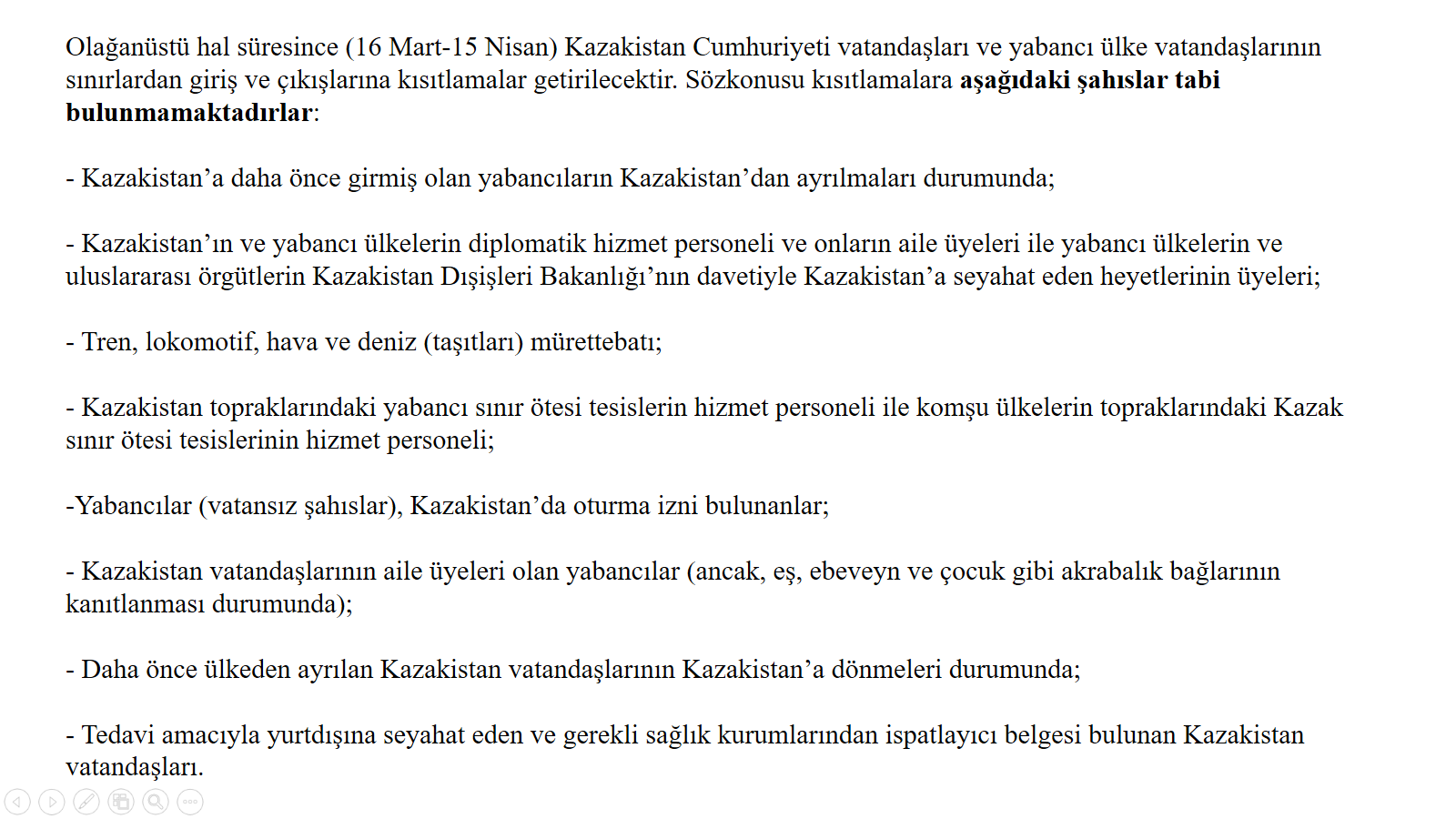 Sözkonusu kısıtlamalar vatandaşlarımızın Kazakistan’dan ayrılışlarına yasak getirmemektedir.Kazakistan’da ikamet izni bulunan vatandaşlarımız da anılan kısıtlamalardan muaf tutulmuşlarıdır. Ancak ekte belirtilen istisnai şartları taşımayan vatandaşlarımızın Kazakistan’a girişlerine kısıtlama getirilmiştir.